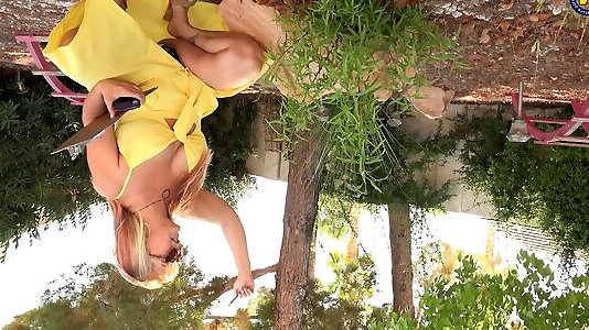 Platinum-blonde in jeans miniskirt Katrin Hairy Man rides manstick by the pool