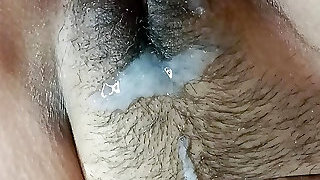 cheating wife squeezing out cum from her gaping pussy